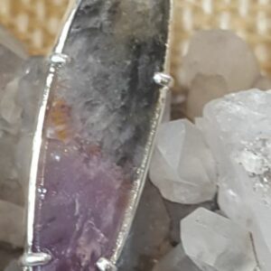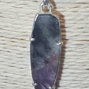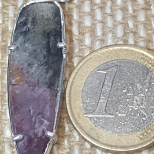 Le pendentif présenté est de couleur grise (présence de la goethite, un oxyde de fer noir), présente du violet lié à la présence d’améthyste, ainsi qu’une couleur orange lié à la cacoxénite.