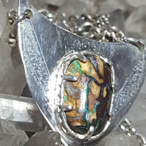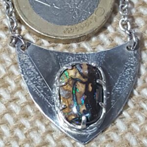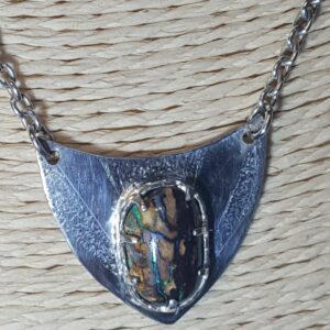 Le sertissage a été réalisé en argent 950 à mon atelier, ainsi que la texture sur l’argent.