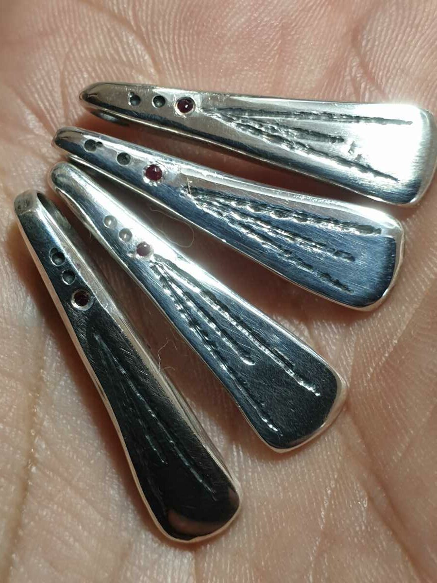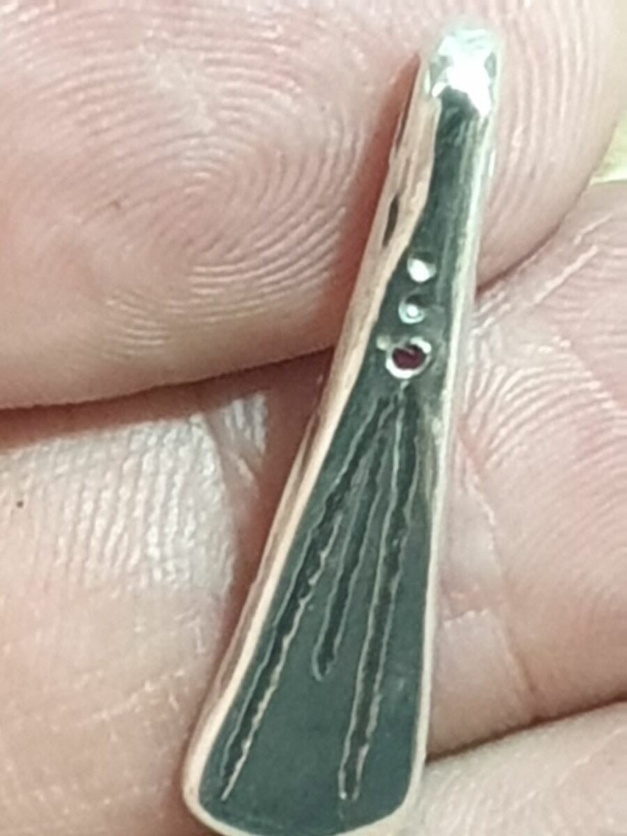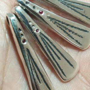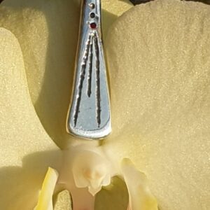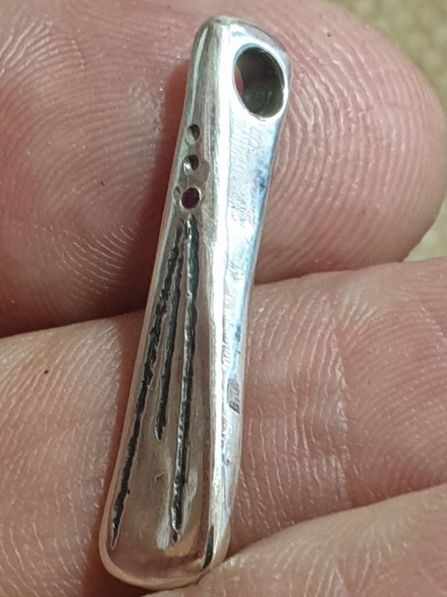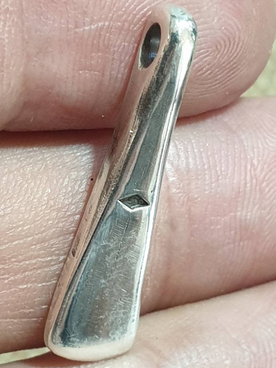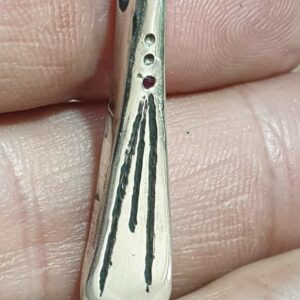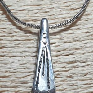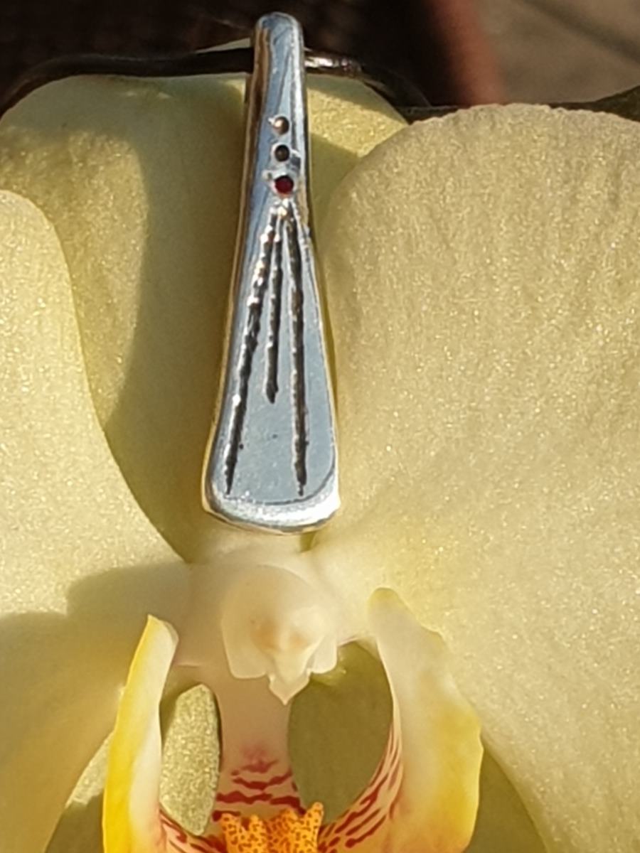 J’ai dessiné ce pendentif awen comme une variante du symbole originel, en gardant les traits que j’ai gravé dans l’argent (950/1000) et en les oxydant.