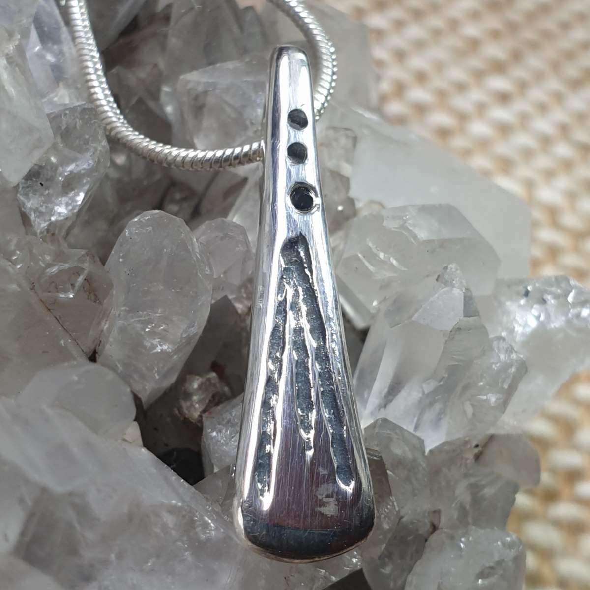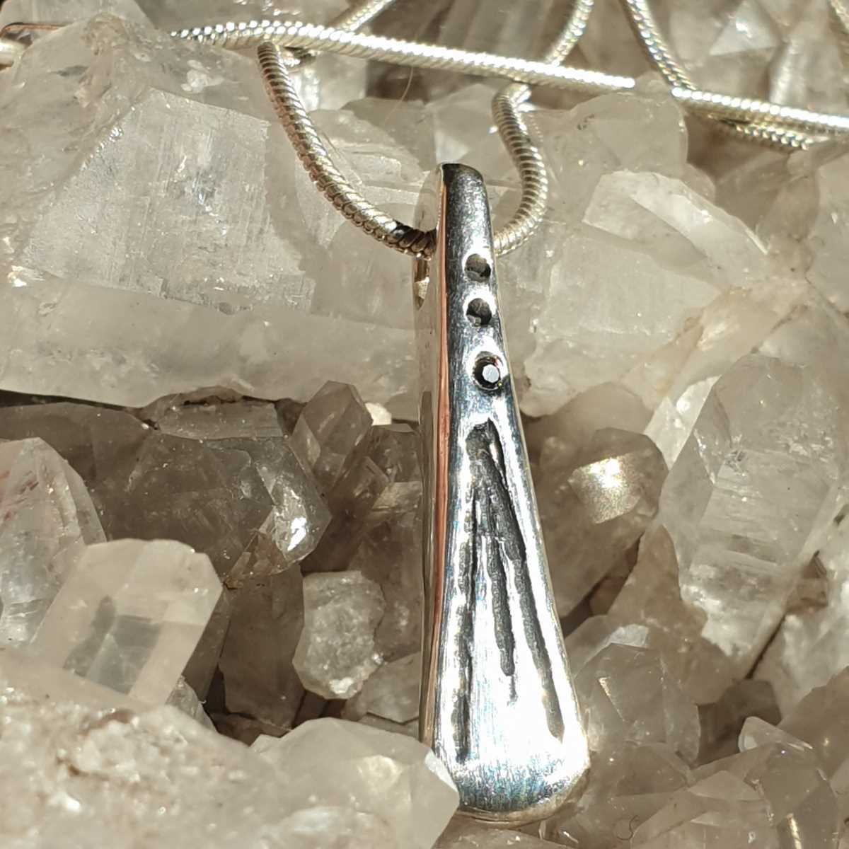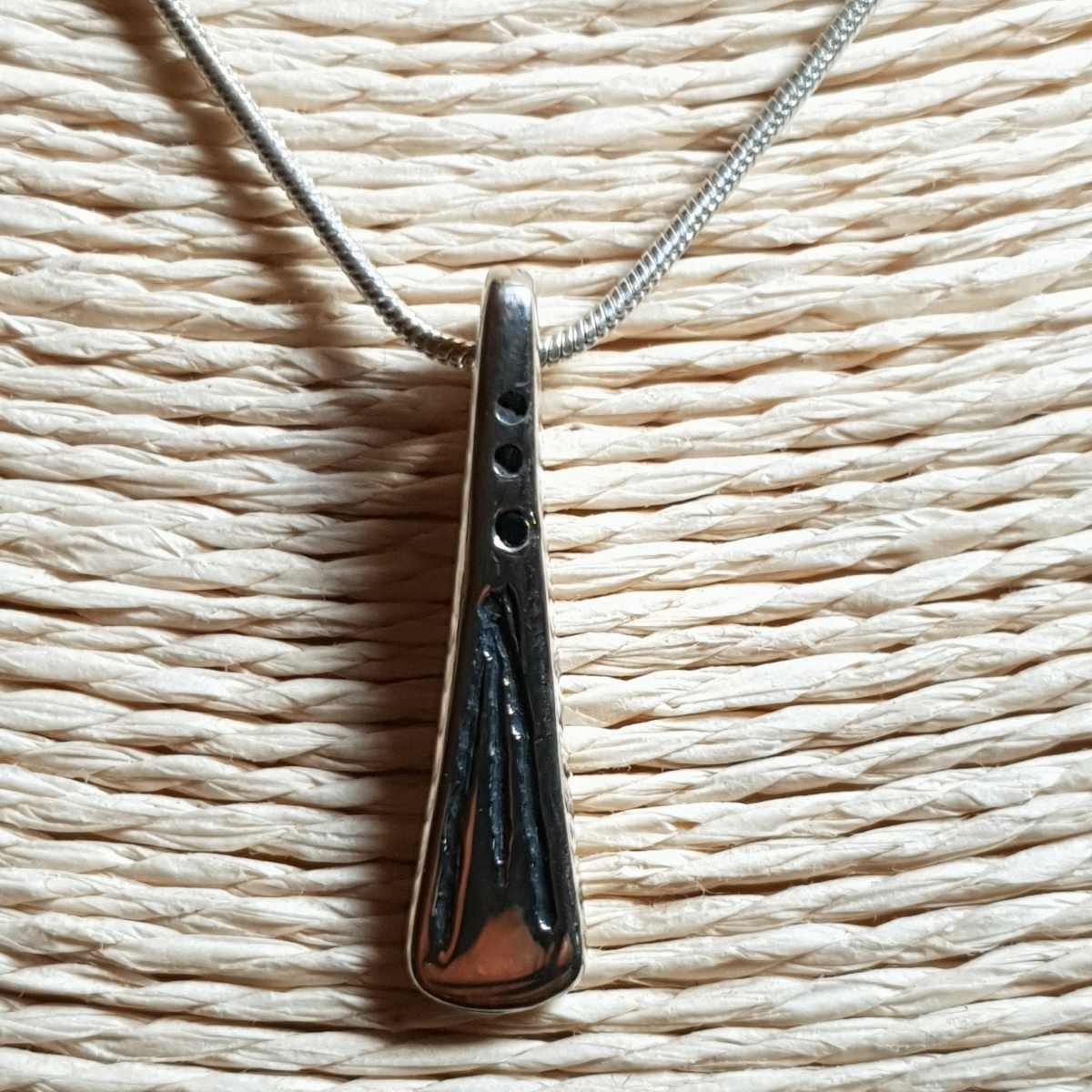 Le travail réalisé à mon atelier est 100% artisanal, le pendentif peut laisser apparaitre des traces de frappe (je pars d’un morceau d’argent et je le martèle à chaud), des traces légères de lime, des asymétries, bref, les petits défauts qui font de ce pendentif une pièce unique.