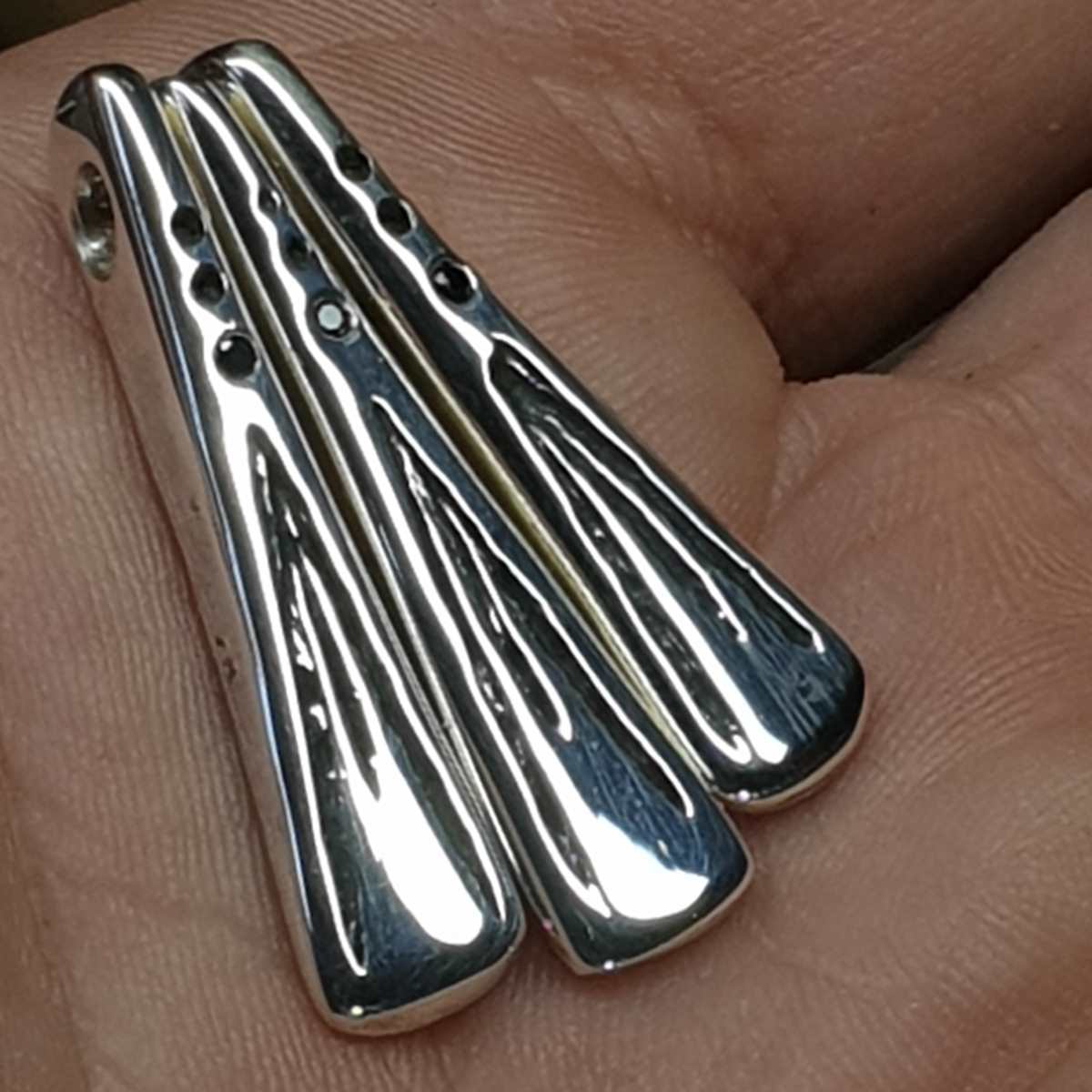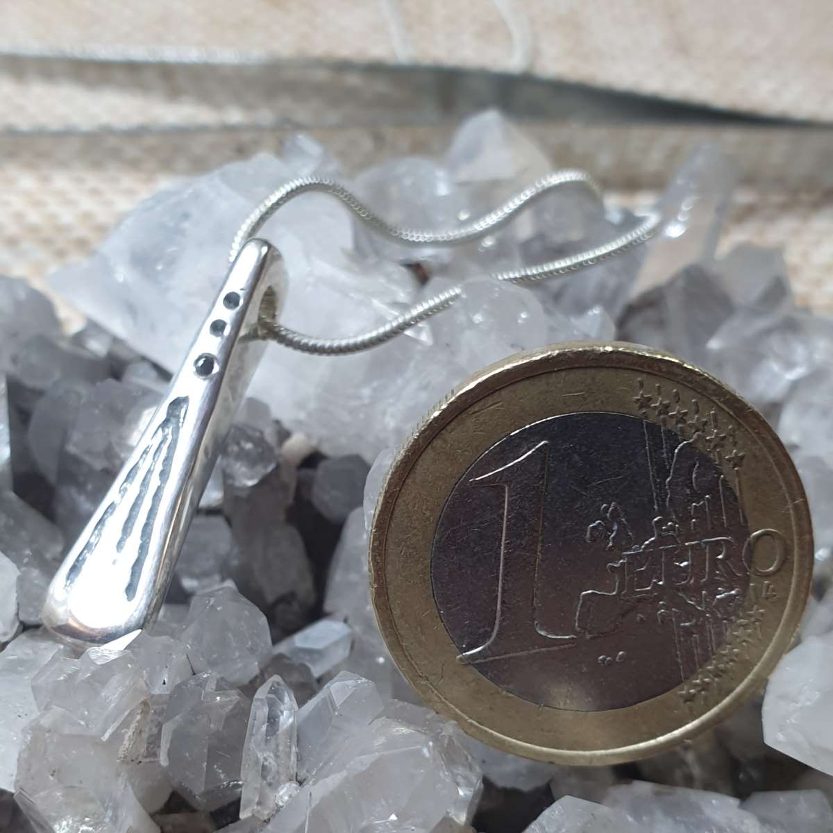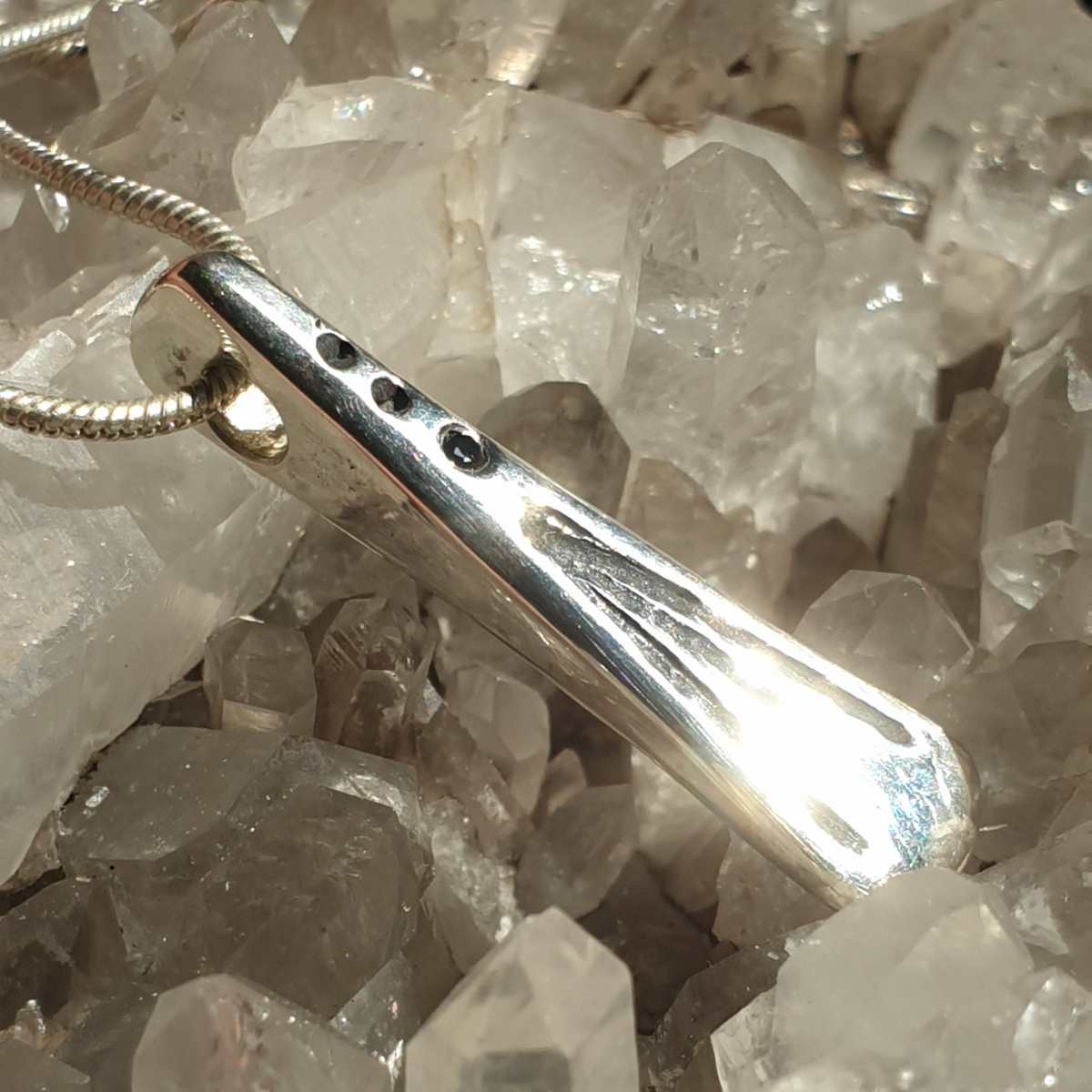Le travail réalisé à mon atelier est 100% artisanal, le pendentif peut laisser apparaitre des traces de frappe (je pars d’un morceau d’argent et je le martèle à chaud), des traces légères de lime, des asymétries, bref, les petits défauts qui font de ce pendentif une pièce unique.