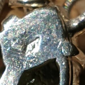 Cette petite moldavite de 1,10 g, achetée à un revendeur de renom au salon de Ste Marie aux Mines, a été sertie sur argent 950 dans mon atelier dans les Vosges.
