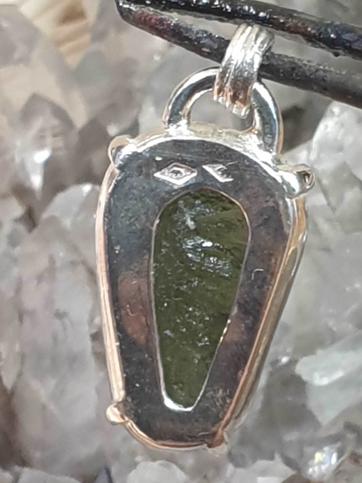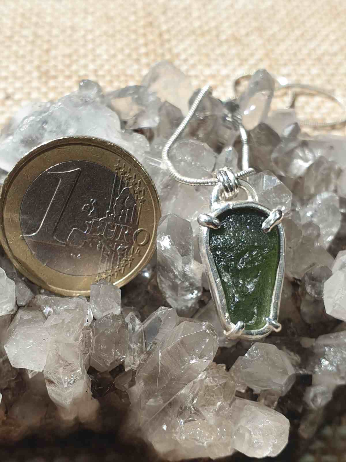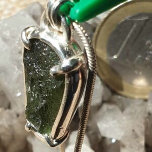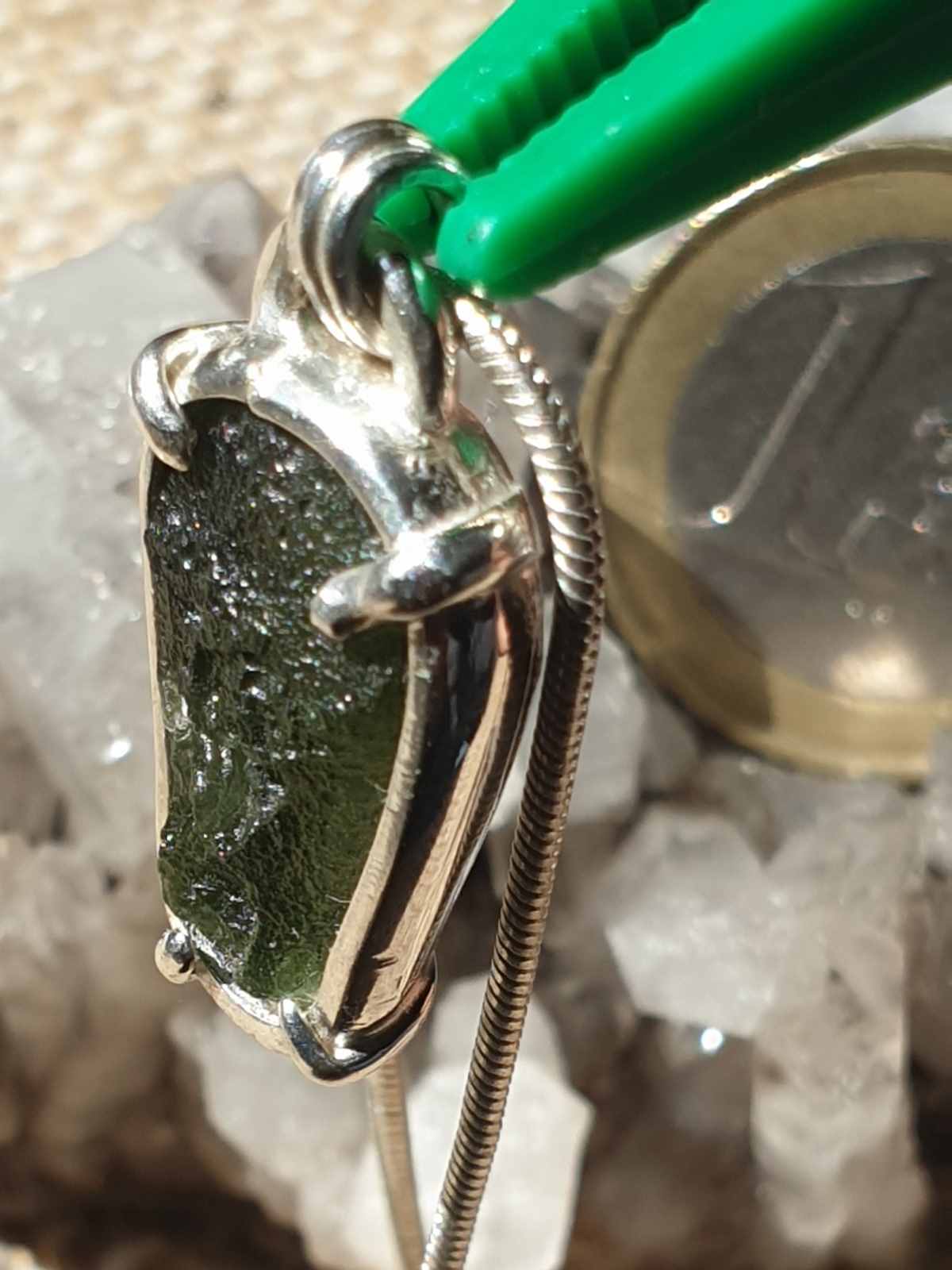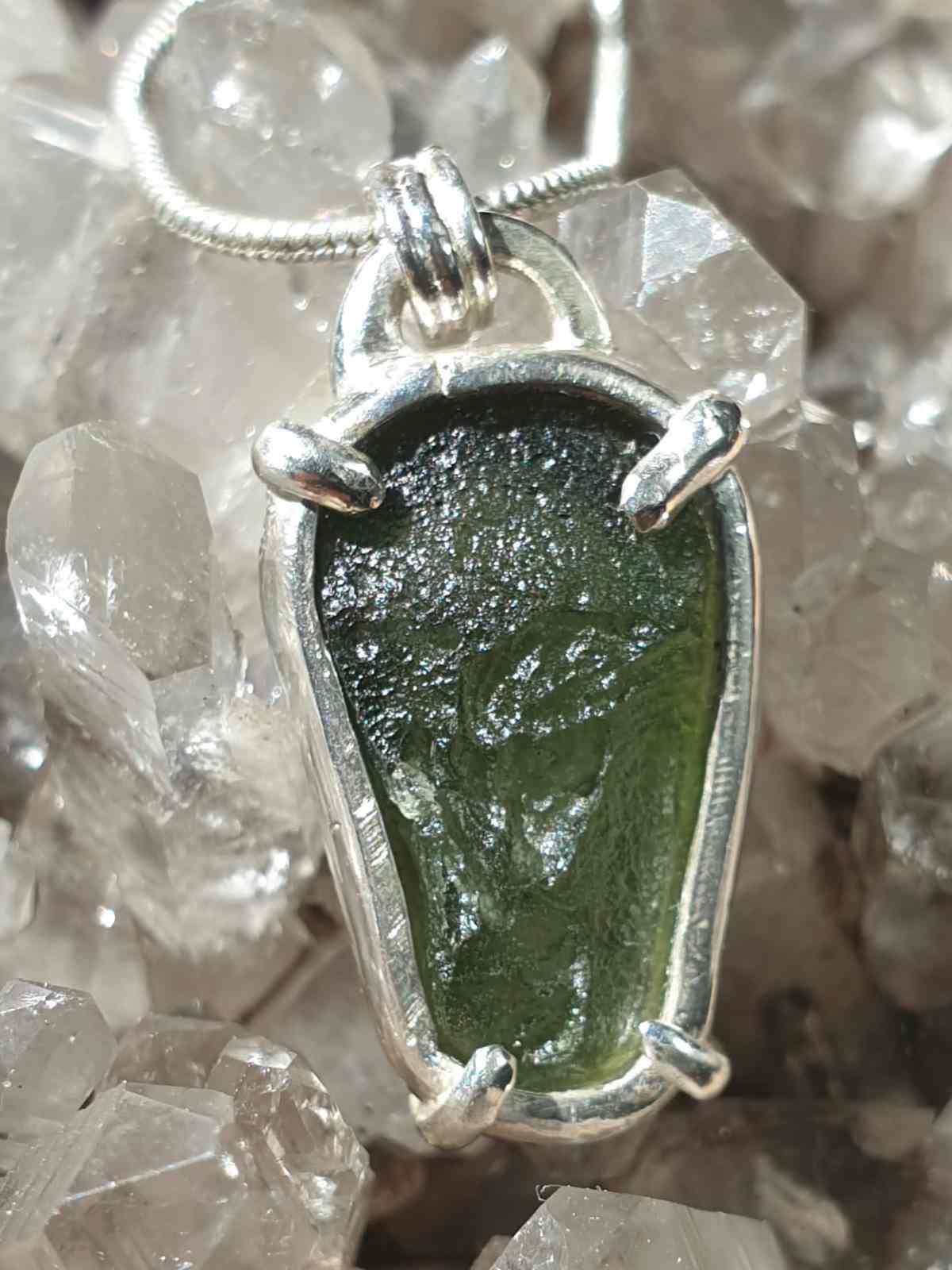 Pendentif en moldavite serti sur argent 950 à mon atelier.