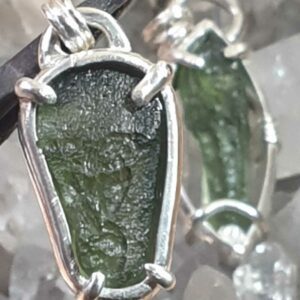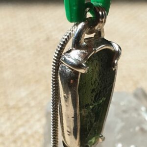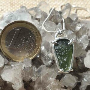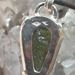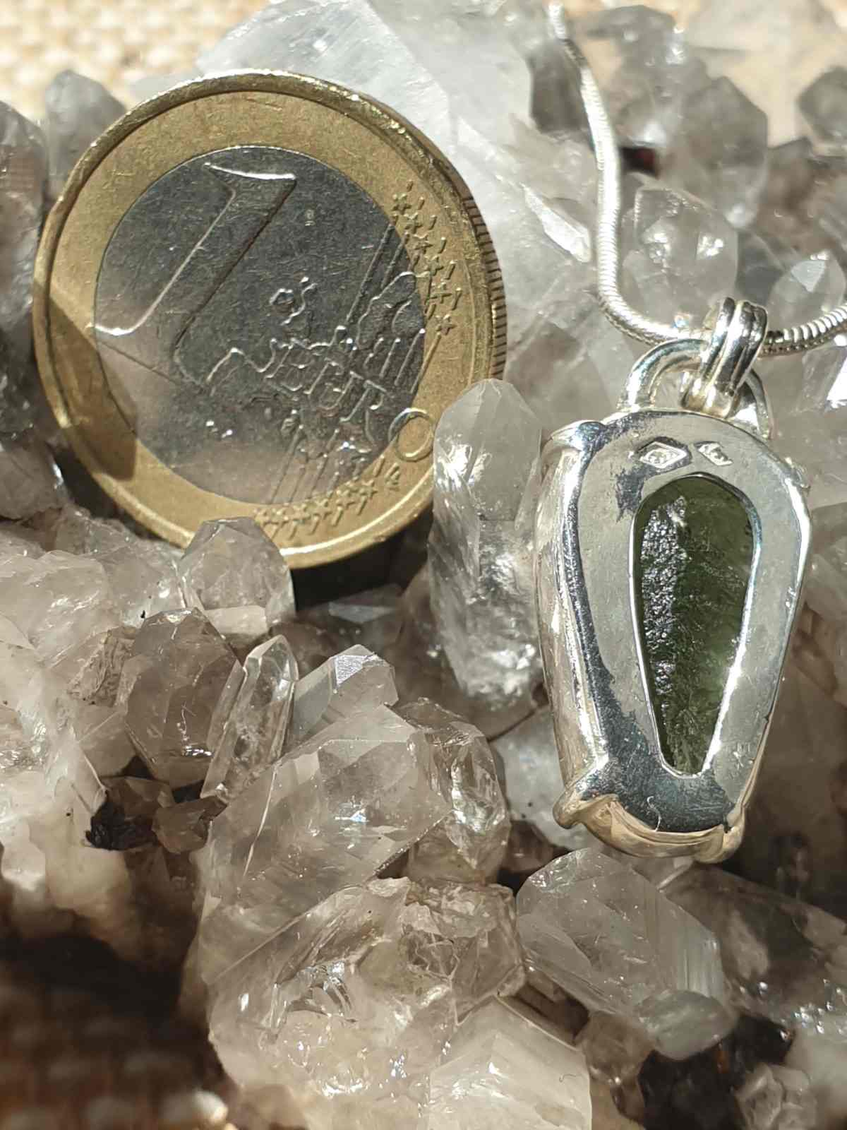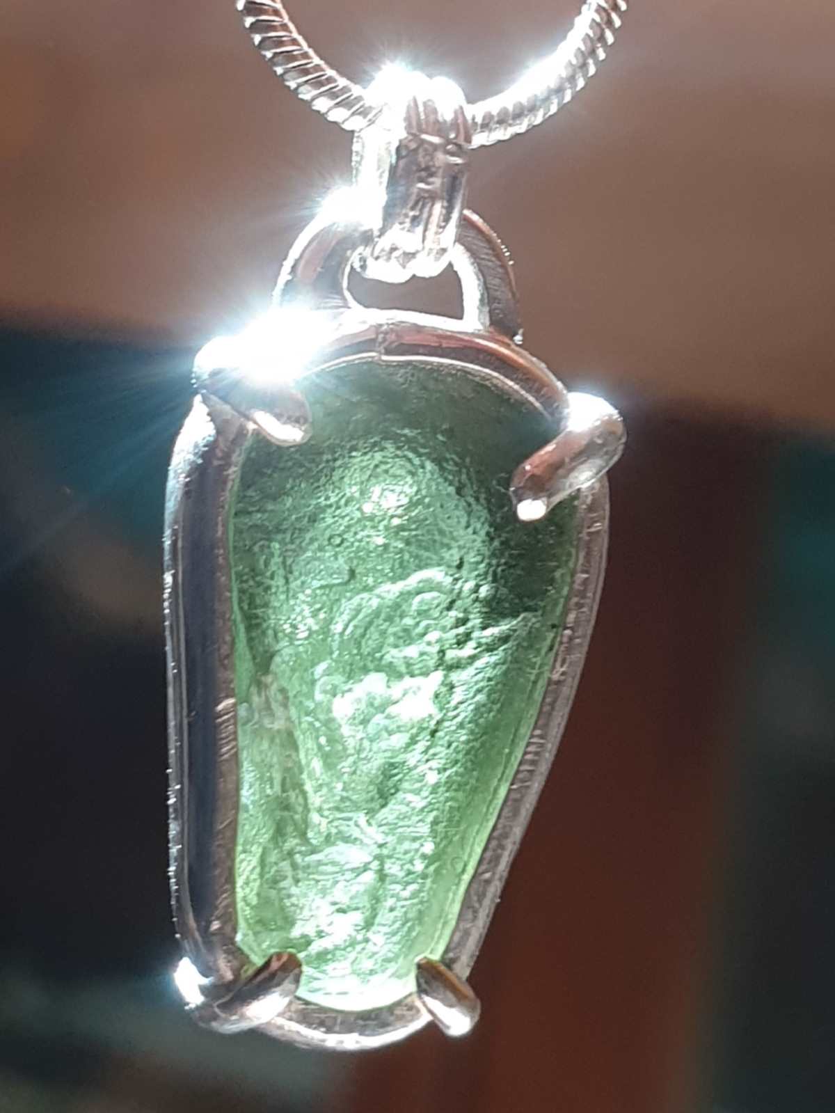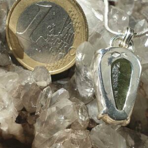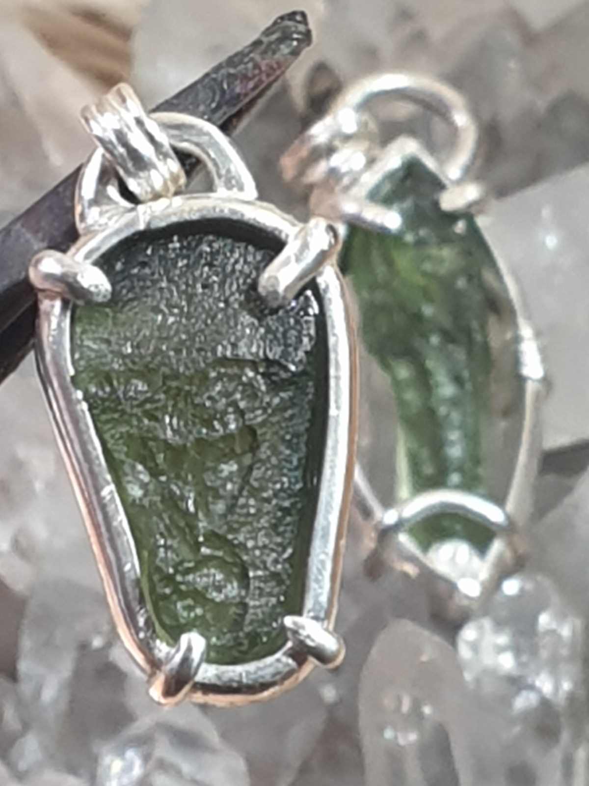 Pendentif en moldavite serti sur argent 950 à mon atelier.